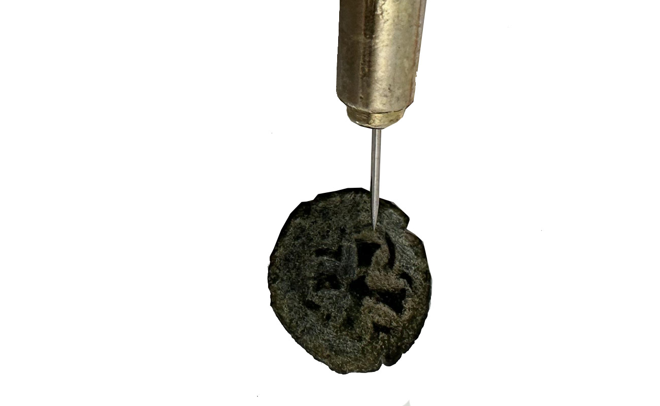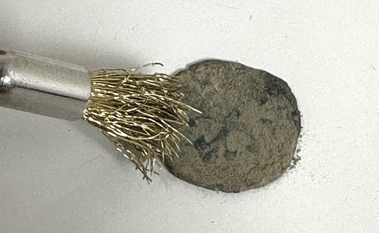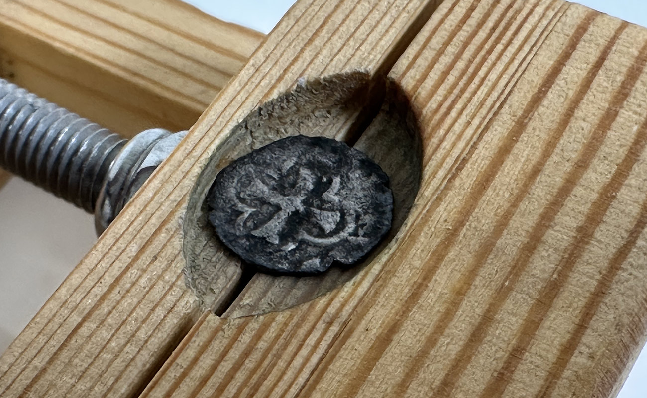 This tiny french coin (15mm) had long remained undefined. Looked like a roman or celtic bronze coin. We first start by removing the crust with the glass fiber tip of the precision pencil. A cross appears, meaning it’s no antique coin but medieval. Such coins were usually ‘billon’ coins: a copper heart with a silver coating. Unfortunately the silver coating has disappeared. let’s restore it ! We use our needle to clean the remaining solid crusts. We nned to get rid of the patina so that the coin goes back « raw ». We use the brass brush of the precision pencil. All patina, meaning here an annoying oxydation, is withdrawn. The copper heart of the coin is now visible with its pink color. We decide to apply our famous Silverfinger on the coin. We let the coin try to absorb the silver liquid for 10 minutes. We get rid of the remaining liquid. Then let it dry. The coin is now cleaned, with its long lost silver coating restored. It’s a François 1er Double Tournois dating 16th century. The last picture shows 2 similar coins. The one on the left was just cleaned, its oxydation has not been removed but unfortunately the silver coating is gone. On hte right, it’s our coin we purposedly removed the oxydation to be able to apply a new silver coating.
